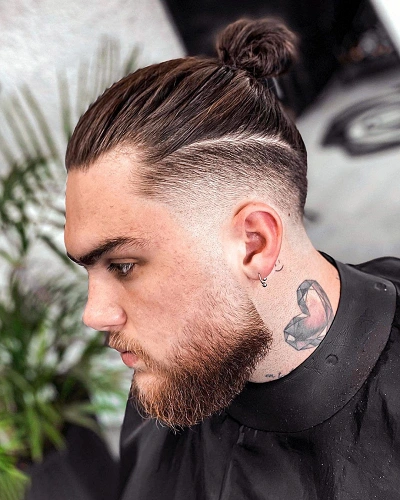 The High Fade Samurai Bun delivers sharp contrast and a commanding presence. The fade begins high near the temples, creating a dramatic separation between the shaved sides and the long top gathered into a tight bun. This samurai haircut version feels powerful and structured; ideal for men who like clean lines and strong silhouettes.